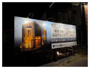 大学の駐輪場へ風通しのよいメッシュターポリン生地で表示板(シート)取付け。また店舗移転新築に伴う安全工事柵壁面にオープン告知広告の提案企画立案から制作・実施工事業務。